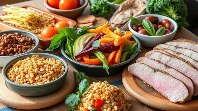 • Obiad: Gulasz mięsny z kaszą i sezonowymi warzywami, co dostarcza białka oraz węglowodanów,